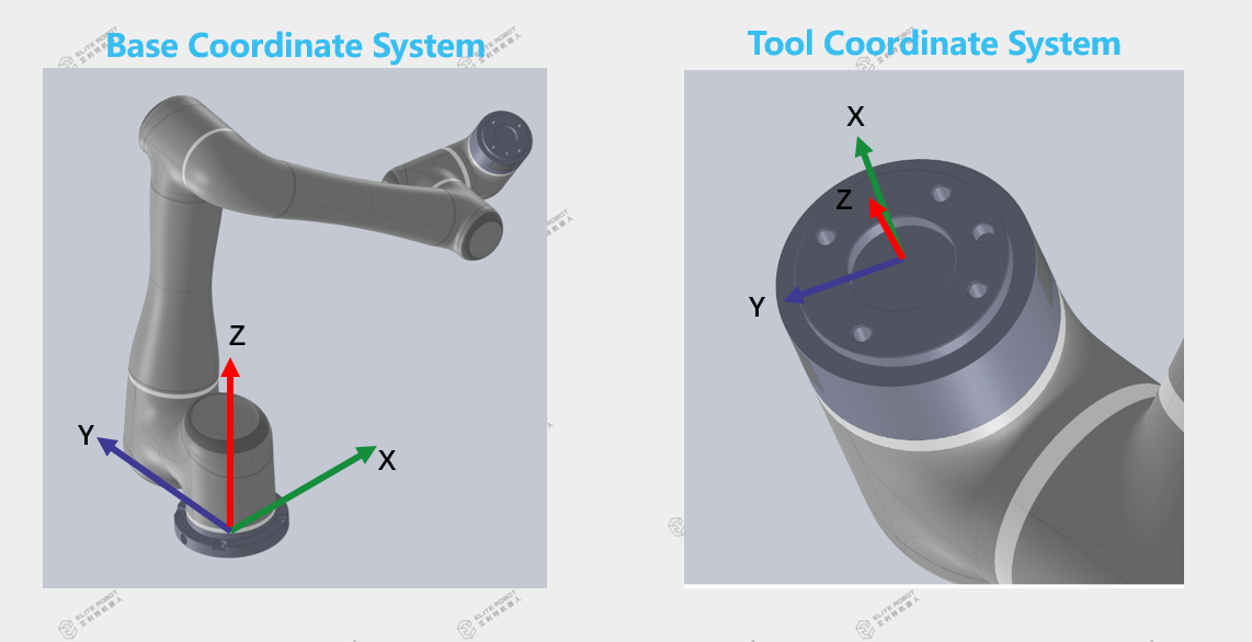 Elite robot is a 6-joint robot, using the right-hand rule Cartesian coordinate system. Elite robot comes with two coordinate systems, one is the base coordinate system, and the other is the tool coordinate system (see the figure below). The base and the tool coordinate system cannot be deleted or changed.