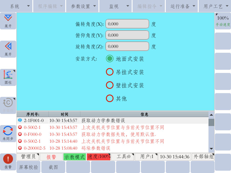 在示On the teaching pendant, click {System} {System Configuration} {Installation Settings} to enter the following interface: