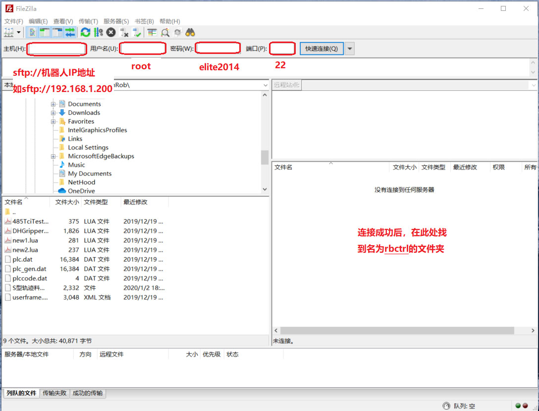 After the Elite robot controller is connected to the PC via a network cable, you need to access the controller's internal files through an FTP software. Take FileZilla as an example: After the PC and the control box successfully establish a connection (ping), open the FTP software. Enter the correct host IP address, username, password, and port number (as shown below).