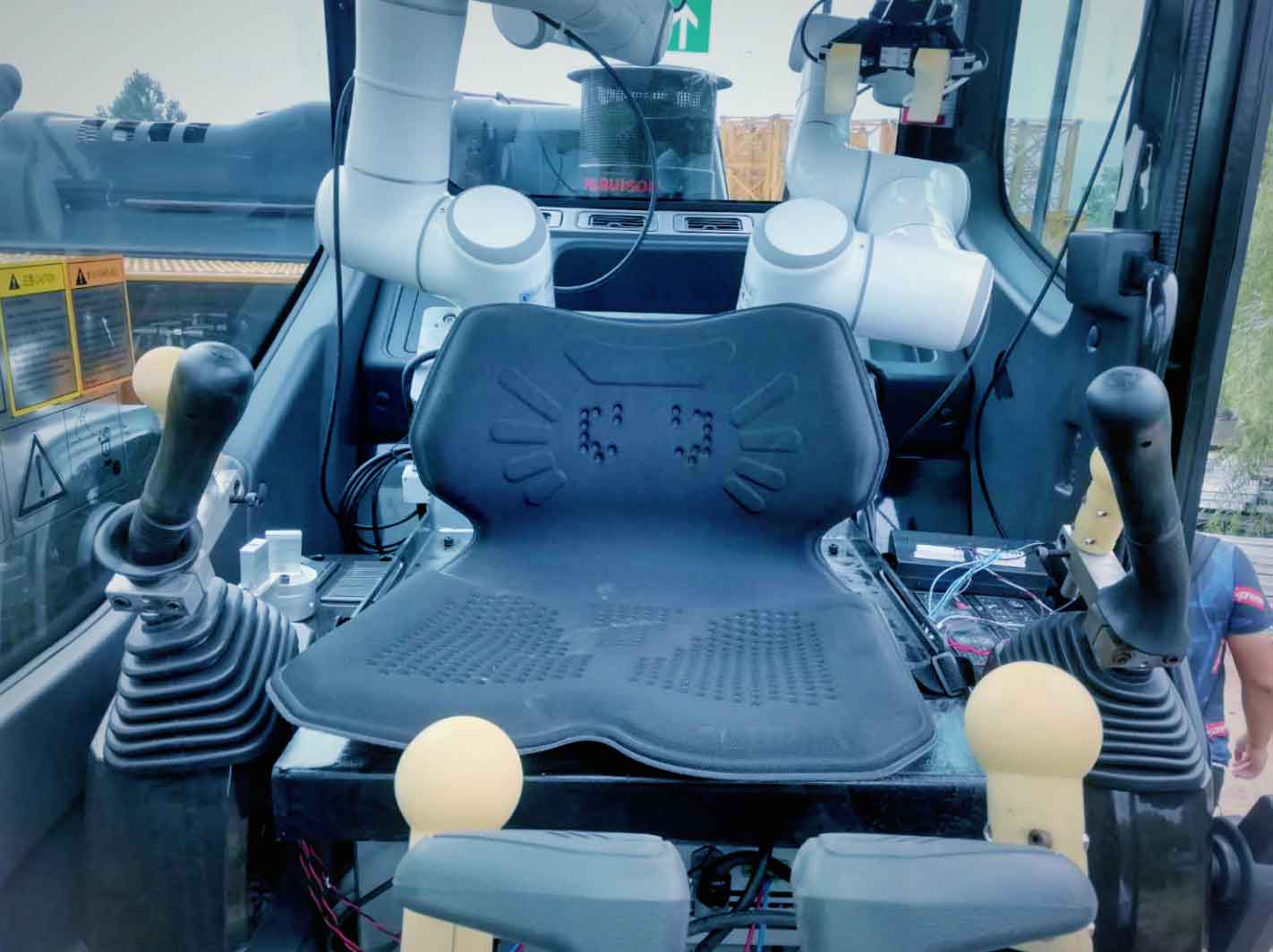 The 6-joint EC63 collaborative robot supports ±360°rotation, has a working radius of 624mm, and weighs only 13kg. The compact structure and flexible space it can reach allow the robot to easily work in small space.It's worth noting that ELITE also designed a seat for the project -- two robotic arms drive the excavator during remote operation, and when the crew wants to enter the cockpit, the arms can be moved to the back of the cockpit to leave room for the driver. The feature that collaborative robots can share operating space with human also ensures the safety of human-machine interaction.The addition of collaborative robots to traditional industries brings imaginations and new ideas.